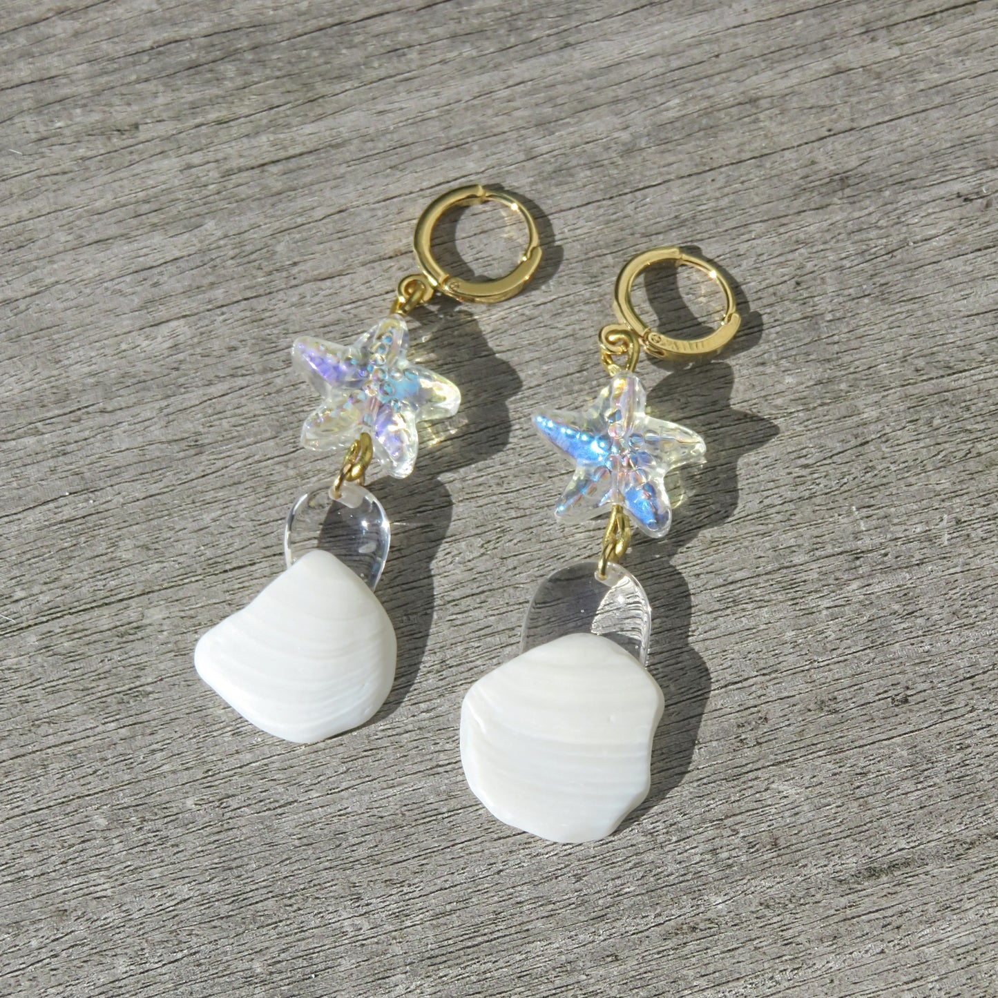 Comme figés dans une goutte d'eau, ces fragments uniques de coquillages apporteront une touche d'éclat et de fraîcheur à vos tenues. À la lumière, la perle de crystal en forme d'étoile de mer se parera de jolis reflets irisés rappelant la surface de la mer ou encore les écailles des poissons au fond de l'océan. ✨