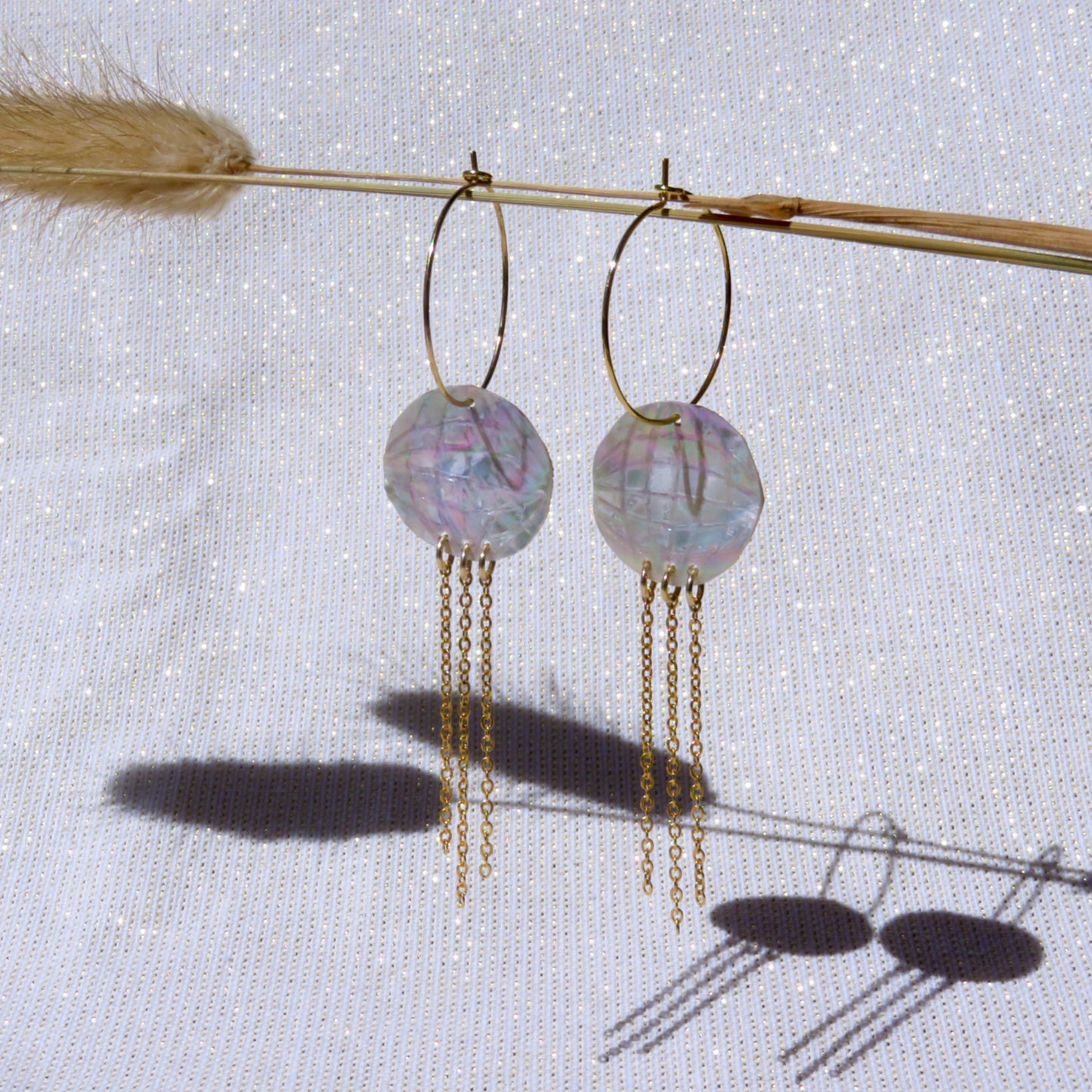 Fabriquées à partir de coquille d'ormeau aux reflets holographiques, ces boules disco proviennent directement du fond des océans pour parer vos oreilles de sublimes couleurs argentées et dorées ! 🪩